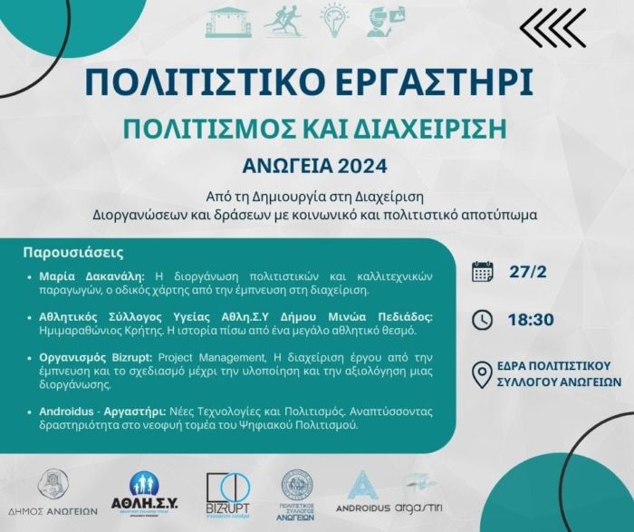 “Με τον Δήμο Ανωγείων και τους παρακάτω συντελεστές απ’ τον χώρο του Αθλητισμού, της Κοινωνικής Καινοτομίας και της Καλλιτεχνικής Παραγωγής, εμπνευστήκαμε και σχεδιάσαμε το πρώτο πολιτιστικό εργαστήριο για την περιοχή του Ψηλορείτη με θέματική: Από τη δημιουργία στη διαχείριση διοργανώσεων και δράσεων με κοινωνικό και πολιτιστικό αποτύπωμα .