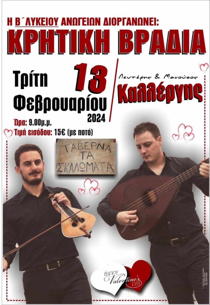 Στην ταβέρνα “Τα Σκαλώματα” θα γίνει αύριο Τρίτη 13 Φεβρουαρίου η Κρητική βραδιά που διοργανώνει η Β’ Λυκείου Ανωγείων, για την οικονομική τους ενίσχυση ενόψει της πενθήμερης εκδρομής που θα πραγματοποιήσουν του χρόνου ως τελειόφοιτοι του “Σταυράκειου”. Η εκδήλωση θα ξεκινήσει στις 9 μ.μ και η είσοδος έχει οριστεί στα 15 ευρώ με ποτό.