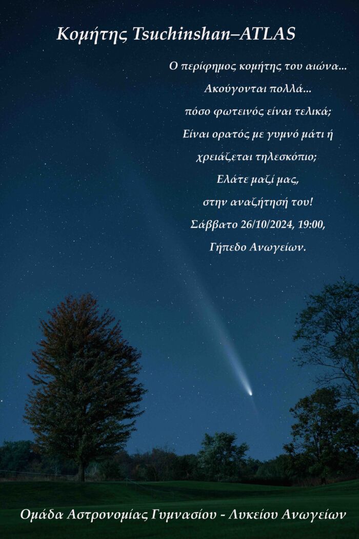 Το Σάββατο, 26/10/2024, το Σταυράκειο Γυμνάσιο και Λύκειο Ανωγείων κάνει αστροπαρατήρηση στο Γήπεδο Ανωγείων, στις 19:00. Επίκεντρο της παρατήρησης θα είναι ο περίφημος κομήτης του αιώνα! O κομήτης θα είναι ορατός λίγο μετά τη δύση του Ήλιου.