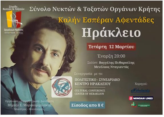 Το Σύνολο Νυκτών & Τοξοτών Οργάνων Κρήτης (Σ.Ν.Τ.Κ.) την Τετάρτη 12 Μαρτίου και ώρα 20.00 στο Πολιτιστικό Συνεδριακό Κέντρο Ηρακλείου παρουσιάζει τη μουσικοχορευτική παράσταση “Καλήν Εσπέραν Αφεντάδες”.