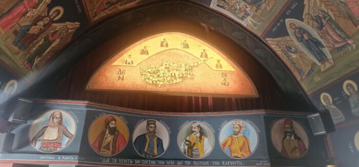 Το μνημείο τοποθετήθηκε μέσα στο Ναό, πάνω από τους ήρωες της Επανάστασης του 1821 και δείχνει το νησί της Κύπρου, σχηματισμένο ως ένα παζλ με πρόσωπα νεκρών και αγνοουμένων, με την επιγραφή “Δεν Ξεχνώ” και γύρω τους Τέσσερις Μάρτυρες του Ρεθύμνου και τον Άγιο Γεώργιο και Άγιο Πολύδωρο της Κύπρου, όπου όλοι μαρτύρησαν επί Τουρκοκρατίας.