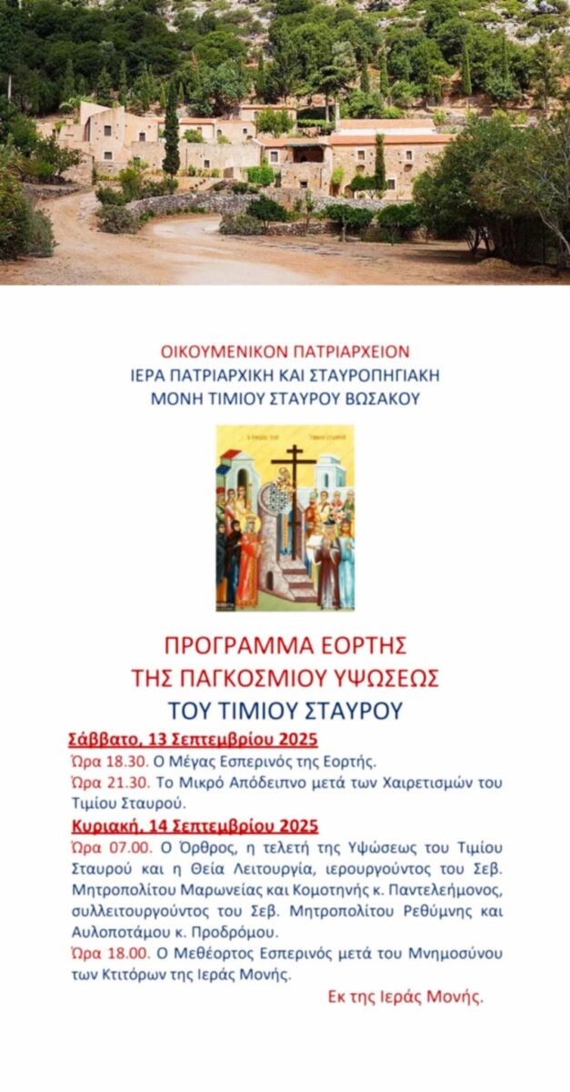 Λίγες ημέρες απέμειναν για την Μεγάλη δεσποτική γιορτή της Χριστιανοσύνης, την Ύψωση του Τιμίου Σταυρού, με την οποία τιμάται η διπλή ανεύρεση του Σταυρού, πάνω στον οποίο μαρτύρησε ο Ιησούς Χριστός και η Ιερά Μονή Βωσάκου προετοιμάζεται να τιμήσει την μεγάλη εορτή.
