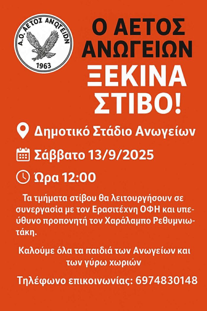 Καλούμε όλους τους δημότες των Ανωγείων, καθώς και των γύρω χωριών, που ενδιαφέρονται να εγγράψουν τα παιδιά τους στα τμήματα στίβου ηλικίες από 10 έως 17 να προσέλθουν το Σάββατο 13 Σεπτεμβρίου 2025 και ώρα 12:00 στον χώρο του Δημοτικού Σταδίου, όπου θα πραγματοποιηθούν οι εγγραφές και θα δοθούν όλες οι απαραίτητες πληροφορίες.