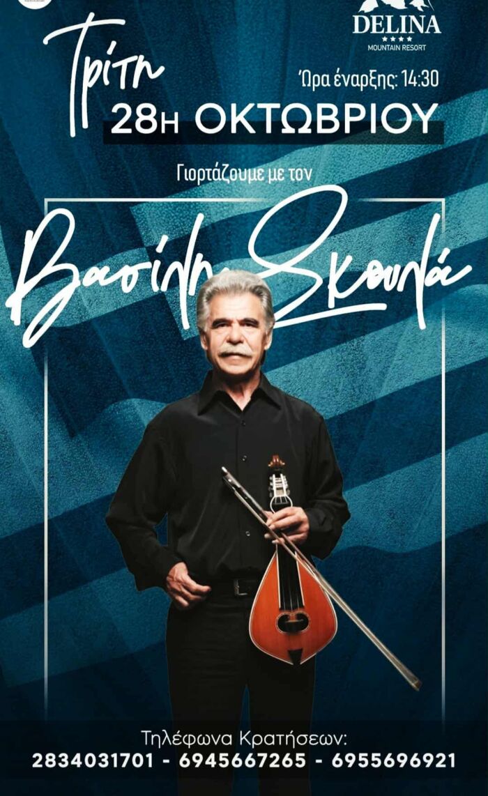 Με μια ζωντανή εμφάνιση του Βασίλη Σκουλά, τιμά η “Ντελίνα” την μεγάλη εθνική επέτειο του “ΟΧΙ”, με τον σπουδαίο καλλιτέχνη να υπόσχεται ευχάριστες στιγμές για όσους επιλέξουν να βρεθούν στα Ανώγεια. Η εκδήλωση θα ξεκινήσει στις 2.30 μ.μ. μετά το μεσημέρι αύριο Τρίτη 28 Οκτωβρίου. Τηλέφωνο κρατήσεων: 28340-31701