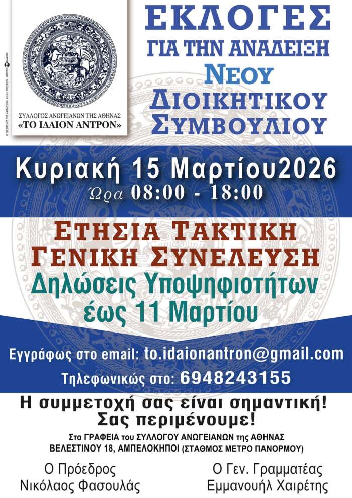 “Καθώς κατά τη σύγκληση της Ετήσιας Τακτικής Γενικής Συνέλευσης του Συλλόγου μας την Κυριακή 8 Μαρτίου 2026 δεν επιτεύχθηκε η προβλεπόμενη απαρτία, σύμφωνα με το καταστατικό του Συλλόγου η Γενική Συνέλευση θα πραγματοποιηθεί την επόμενη Κυριακή, 15 Μαρτίου 2026 και ώρα 08:00 π.μ., στα γραφεία του Συλλόγου (Βελεστίνου 18, Αμπελόκηποι).