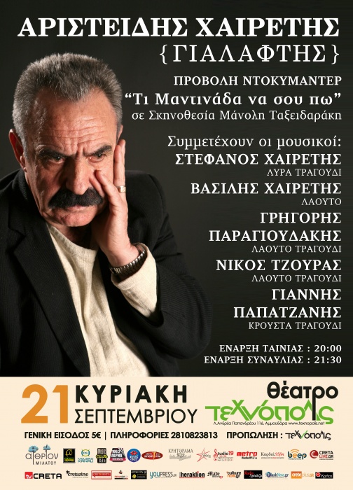 Ο σπουδαίος Ανωγειανός μαντιναδολόγος Αριστείδης Χαιρέτης ή Γιαλάυτης θα τιμηθεί σε μια ιδιαίτερη βραδιά την ερχόμενη Κυριακή 21 Σεπτεμβρίου στις 8.00 μ.μ στο ”Τεχνόπολις” στο Γάζι Ηρακλείου.