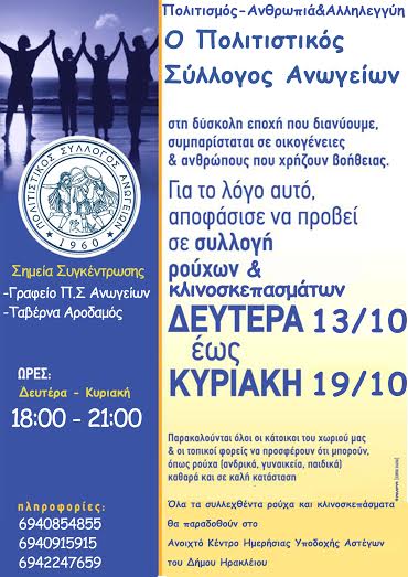 Σε άλλη μια σπουδαία κίνηση ανθρωπιάς και αλληλεγγύης προβαίνει ο Πολιτιστικός σύλλογος Ανωγείων, με την συλλογή ρούχων και κλινοσκεπασμάτων τα οποία θα δοθούν σε ανθρώπους και οικογένειες που τα έχουν πραγματικά ανάγκη στις δύσκολες εποχές που ζούμε και εν όψει του χειμώνα που είναι προ των πυλών.