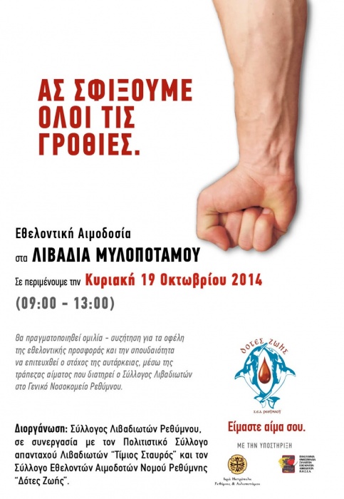 Ο Σύλλογος Λιβαδιωτών Ρεθύμνου, σε συνεργασία με τον Πολιτιστικό Σύλλογο Απανταχού Λιβαδιωτών «Ο Τίμιος Σταυρός» και, με την υποστήριξη του νεοϊδρυθέντος Συλλόγου Εθελοντών Αιμοδοτών Νομού Ρεθύμνης «Δότες Ζωής», διοργανώνει Εθελοντική Αιμοδοσία στα Λιβάδια (στο Κτίριο της Κοινότητας) την Κυριακή 19 Οκτωβρίου 2014, από τις 10.00 έως τις 13.00.