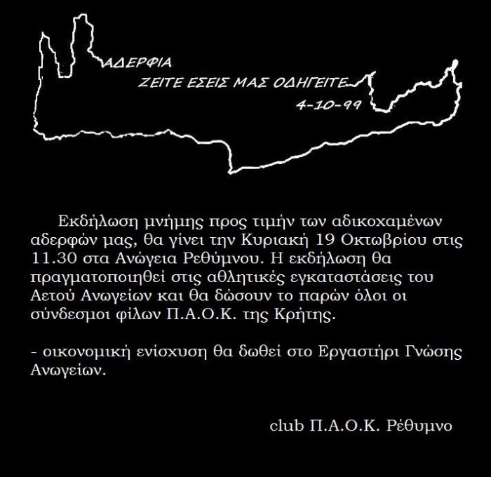 Την ερχόμενη Κυριακή 19 Οκτωβρίου στις 11.30 π.μ θα γίνει στο Δημοτικό στάδιο Ανωγείων η εκδήλωση φόρος-τιμής στα θύματα του τροχαίου δυστυχήματος στα Τέμπη στις 4 Οκτωβρίου 1999 που στοίχισε την ζωή σε έξι νεαρούς φιλάθλους του Π.Α.Ο.Κ Θεσσαλονίκης που επέστρεφαν από την Αθήνα μετά από παιχνίδι της ομάδας τους με τον Παναθηναϊκό.
