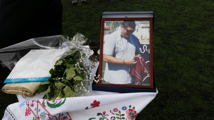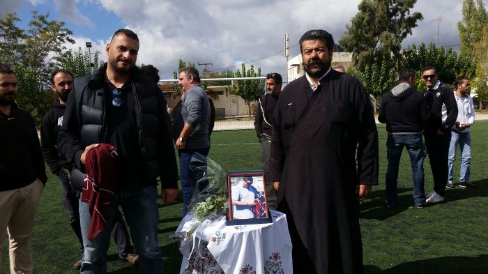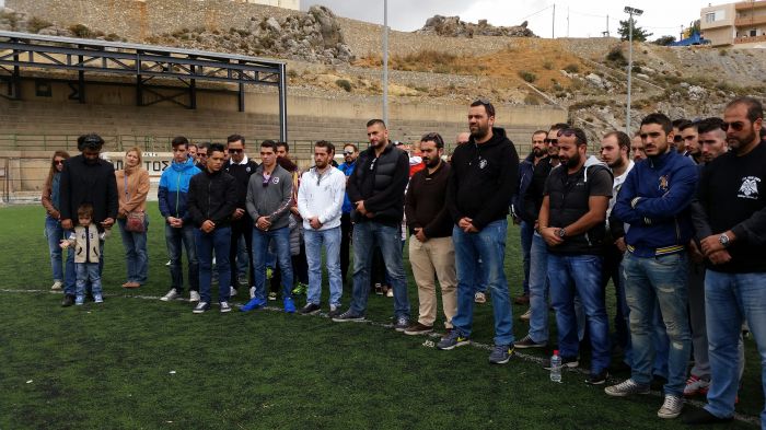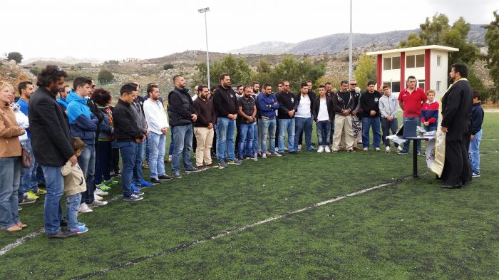 Τρισάγιο στη μνήμη των έξι αετόπουλων και του Παναγιώτη Ποικιλίδη τέλεσε στο κέντρο του γηπέδου ο π.Ανδρέας Κεφαλογιάννης ενώ μπροστά του στο τραπεζάκι δέσποζε η μορφή του Ποικιλίδη κρατώντας τη φανέλα του Αετού Ανωγείων και πίσω ένα πανό με τις μορφές των έξι παιδιών.