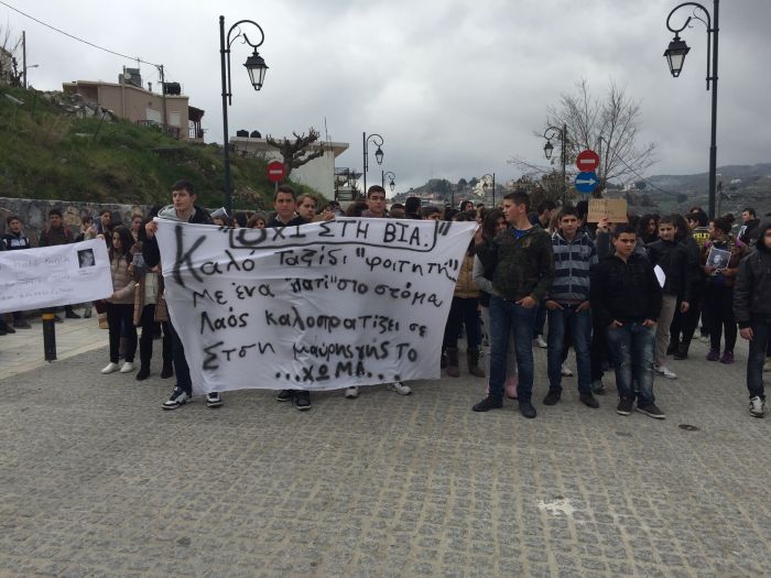 Με αυτή τη μαντινάδα γραμμένη σε ένα πανό πραγματοποίησαν την Τρίτη οι μαθητές των Ανωγείων βουβή πορεία στους δρόμους του χωριού, στις 12 μ.μ την ώρα ακριβώς που γινόταν η κηδεία του άτυχου Βαγγέλη Γιακουμάκη στο Σελί Ρεθύμνου.