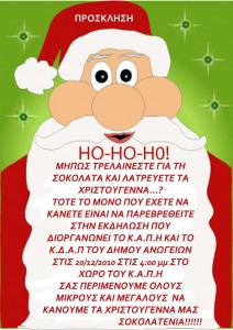 Μέσα σε αυτά τα πλαίσια σήμερα 20 Δεκεμβρίου 2010 και ώρα 4:00 μ.μ το Κ.Α.Π.Η Ανωγείων σε συνεργασία με το Κ.Δ.Α.Π ( Κέντρο Δημιουργικής Απασχόλησης Παιδιών) και τις σπουδάστριες του τμήματος κοινωνικής εργασίας πρόκειται να πραγματοποιήσουν μια εκδήλωση με θέμα ’’ Τα σοκολατένια Χριστούγεννα’’. Σκοπός της εκδήλωσης είναι το σμίξιμο των ηλικιωμένων με τα παιδιά.