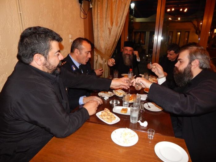 Αργότερα ο π.Ανδρέας παρέθεσε γεύμα σε παραδοσιακή ταβέρνα του χωριού στην συνοδεία του Μητροπολίτη Ρεθύμνης καθώς και στους γονείς των μαθητών της Έκτης δημοτικού.