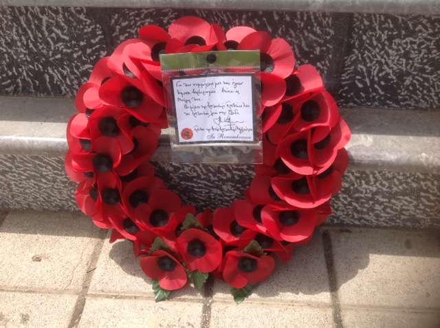 “Για τους συμμάχους μας που έγιναν θύματα βαρβαρισμού.Αιωνία η μνήμη τους.Εκ μέρους της Βρετανικής Πρεσβείας και του Βρετανικού λαού, στην Ελλάδα. Τζον Κίτμερ, Πρέσβης της Αυτού Βρετανικής Μεγαλειότητας..”.