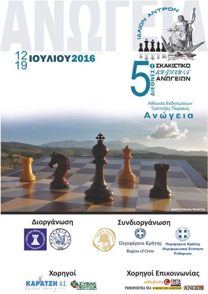 Ο Σκακιστικός Όμιλος Ανωγείων διοργανώνει και φέτος, για πέμπτη συνεχόμενη χρονιά το Διεθνές Σκακιστικό Τουρνουά “Ιδαίον Άντρο”, που θα διεξαχθεί από τις 12 έως τις 19 Ιουλίου στην αίθουσα εκδηλώσεων της Τράπεζας Πειραιώς.Με συμμετοχές παιχτών από εννιά χώρες, ανάμεσα στους οποίους θα βρίσκονται έξι γκράνμαιτρ και τέσσαρων διεθνή μαίτρ, το τουρνουά αναμένεται να είναι συναρπαστικό και να συγκεντρώσει τα φώτα της δημοσιότητας για μια εβδομάδα με το επίπεδο και την ποιότητα του.