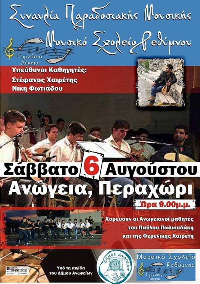 Εκδήλωση Παραδοσιακής Μουσικής Από το Μουσικό Σχολείο Ρεθύμνου θα γίνει αύριο Σάββατο 6 Αυγούστου,στο Περαχώρι στις 9 μ.μ στα πλαίσια των εκδηλώσεων του Δήμου Ανωγείων “Πέτρας Πολιτισμός”.Υπεύθυνοι καθηγητές είναι ο Χαιρέτης Στέφανος και Νίκη Φωτιάδου