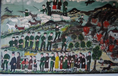 Οι γυναίκες μετά που μου φέρανε το νερό εφύγανε στο χωριό. Εγώ αφού είχα νερό δε μ’ένοιαζε που επόμεινα αμοναχός. Επήγανε να φέρουνε φαγητό γιατί επεινάσαμε πολύ τσι 8 μέρες που εκάμαμε στην τρύπα. Εγυρίσανε και εφέρανε το πηχτό γάλα του κουτιού, ήτανε και οζά και επιάσαμε μια κατσίκα και εσφάξαμέ τη. Ο αδερφός μου ήρθε και την έσφαξε ο Γιάννης ο Σπιθούρης. Η αίγα ήτονε του Μπαμπακονικόλα. Ετότες μού’πανε οι γυναίκες ότι οι Γερμανοί εκάψανε τα Ανώγεια και τα σπίτια μας, όλα.
