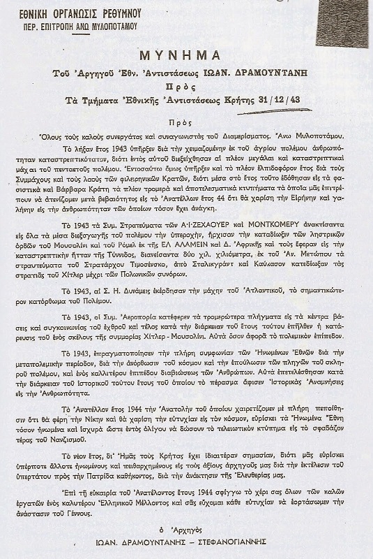 Με τη λήξη του έτους 1943 και την Ανατολή του νέου ελπιδοφόρου έτους 1944, ο Αρχηγός Εθνικής Αντίστασης Γιάννης Δραμουντάνης ή Στεφανογιάννης απηύθυνε μήνυμα προς τους κατοίκους του Πάνω Μυλοποτάμου.