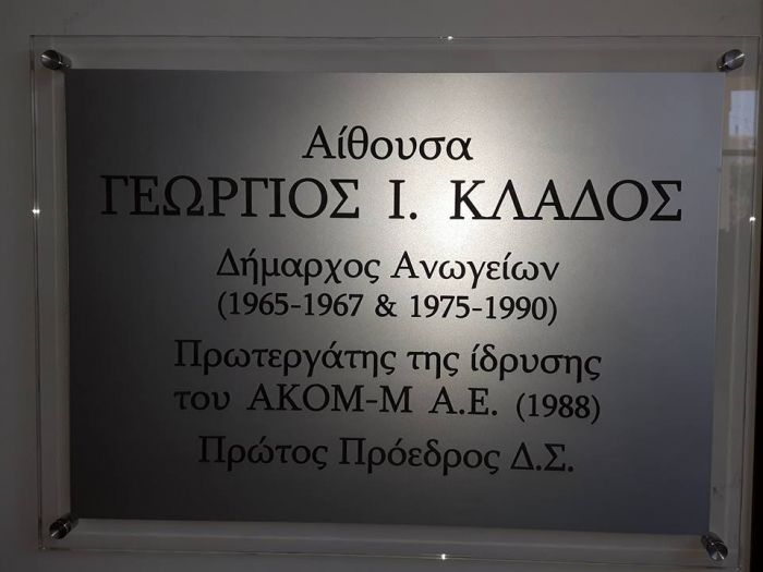 Παρουσία πλήθους κόσμου και επισήμων έγινε την Κυριακή 2 Ιουλίου στον χώρο του ΑΚΟΜΜ στα Ανώγεια, η εκδήλωση που διοργάνωσε ο Δήμος Ανωγείων και το ΑΚΟΜΜ-Ψηλορείτης ΑΑΕ-ΟΤΑ, στην οποία έγινε η ονοματοδοσία της αίθουσας εκδηλώσεων στο χώρο του κέντρου ενημέρωσης του Φυσικού Πάρκου Ψηλορείτη, σε “Αίθουσα Γεώργιος Ι.Κλάδος” προς τιμήν του σπουδαίου αγωνιστή και πρώην δημάρχου Ανωγείων. Παρόν στην εκδήλωση ο ίδιος ο π.δήμαρχος Ανωγείων κ.Κλάδος με τη σύντροφο της ζωής του Βαγγελιώ, περιστοιχισμένος από πολλούς επίσημους φορείς και απλούς πολίτες που βρέθηκαν εκεί για να τον τιμήσουν. Ανάμεσα στους παρευρισκόμενους ήταν ο Γ.Γ του Υπουργείου Εσωτερικών κ.Κωνσταντίνος Πουλάκης, ο Δήμαρχος Ανωγείων κ.Μανόλης Καλλέργης,ο Περιφερειάρχης Κρήτης κ.Σταύρος Αρναουτάκης, ο Δήμαρχος Ηρακλείου κ.Βασίλης Λαμπρινός, ο Βουλευτής Ηρακλείου κ.Σπύρος Δανέλλης, οι πρώην δήμαρχοι Ανωγείων κ.Σωκράτης Κεφαλογιάννης και κ.Νίκος Ξυλούρης και άλλοι.