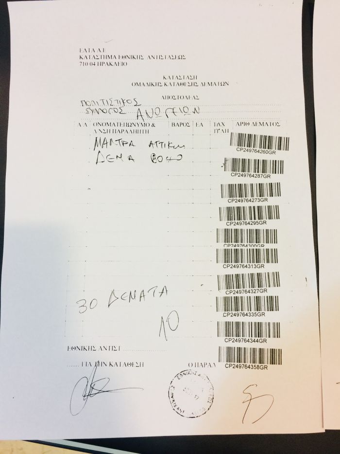 Η δράση μας στέφτηκε με απολυτή επιτυχία, αφού μέσα σε ένα μικρό χρονικό διάστημα καταφέραμε να συγκεντρώσουμε 30 γεμάτα δέματα , τα οποία την Πέμπτη 30 Νοεμβρίου παρεδόθησαν στα Ελληνικά ταχυδρομεία στο Ηράκλειο, και στις επόμενες ημέρες θα ταξιδέψουν μαζί με την αγάπη μας για την Αθήνα, απαλύνοντας λίγο τον μεγάλο πόνο των συμπολιτών μας.
