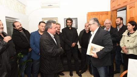 Επόμενος σταθμός στο χωριό, μετά τα γραφεία της Κομματικής Οργάνωσης, το Δημαρχείο. Ο Δήμαρχος,Μανώλης Καλλέργης, μαζί με στελέχη της Δημοτικής Αρχής προσέφερε στον ΓΓ της ΚΕ του ΚΚΕ βιβλία αφιερωμένα στα Ανώγεια και την ιστορία τους.