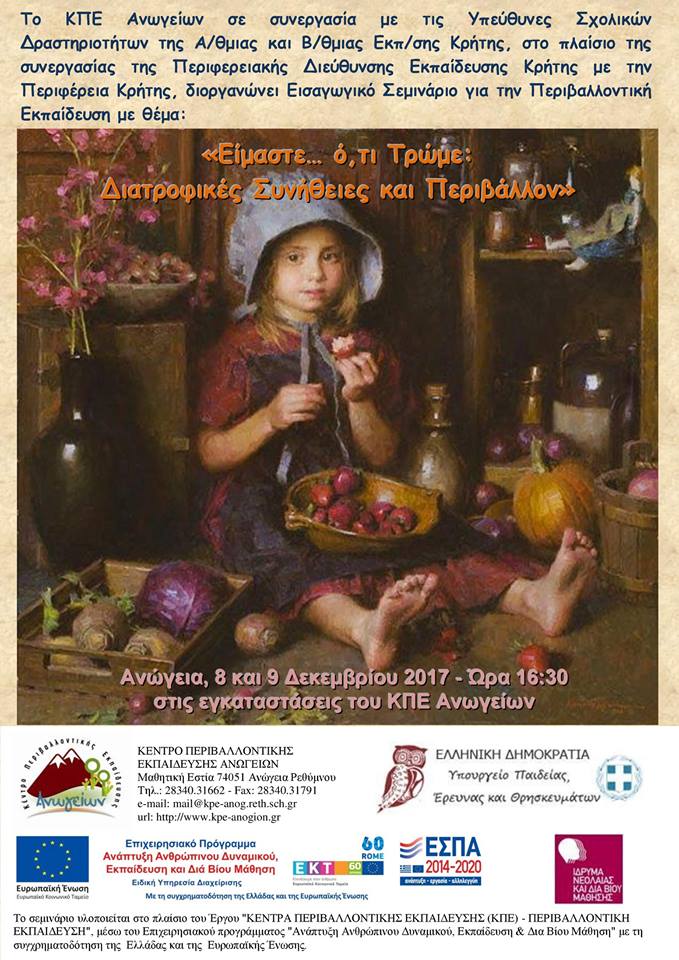 Το ΚΠΕ Ανωγείων σε συνεργασία με τους Υπεύθυνους Σχολικών Δραστηριοτήτων της Α/θμιας και Β/θμιας Εκπ/σης της Περιφέρειας Κρήτης και την Περιφέρεια Κρήτης, στο πλαίσιο της συνεργασίας της Περιφερειακής Διεύθυνσης Εκπαίδευσης Κρήτης με την Περιφέρεια Κρήτης και τα ΚΠΕ Κρήτης, διοργανώνει διήμερο επιμορφωτικό Εισαγωγικό Σεμινάριο Α΄ Επιπέδου στην Περιβαλλοντική Εκπαίδευση την Παρασκευή 8 (απόγευμα) και Σάββατο 9 (πρωί) Δεκεμβρίου 2017 στα Ανώγεια, για εκπαιδευτικούς Α/θμιας και Β/θμιας Εκπ/σης, οι οποίοι δεν έχουν προηγούμενη εμπειρία στην Π.Ε. και πρόκειται να υλοποιήσουν πρόγραμμα Π.Ε. το σχολικό έτος 2017-18. Ένας από τους στόχους της UNESCO για την Αειφόρο Ανάπτυξη μέχρι το 2030 (Ατζέντα 2030) είναι η Υπεύθυνη κατανάλωση και παραγωγή, πώς δηλαδή θα διασφαλίσουμε τη βιώσιμη κατανάλωση και τις μεθόδους παραγωγής.
