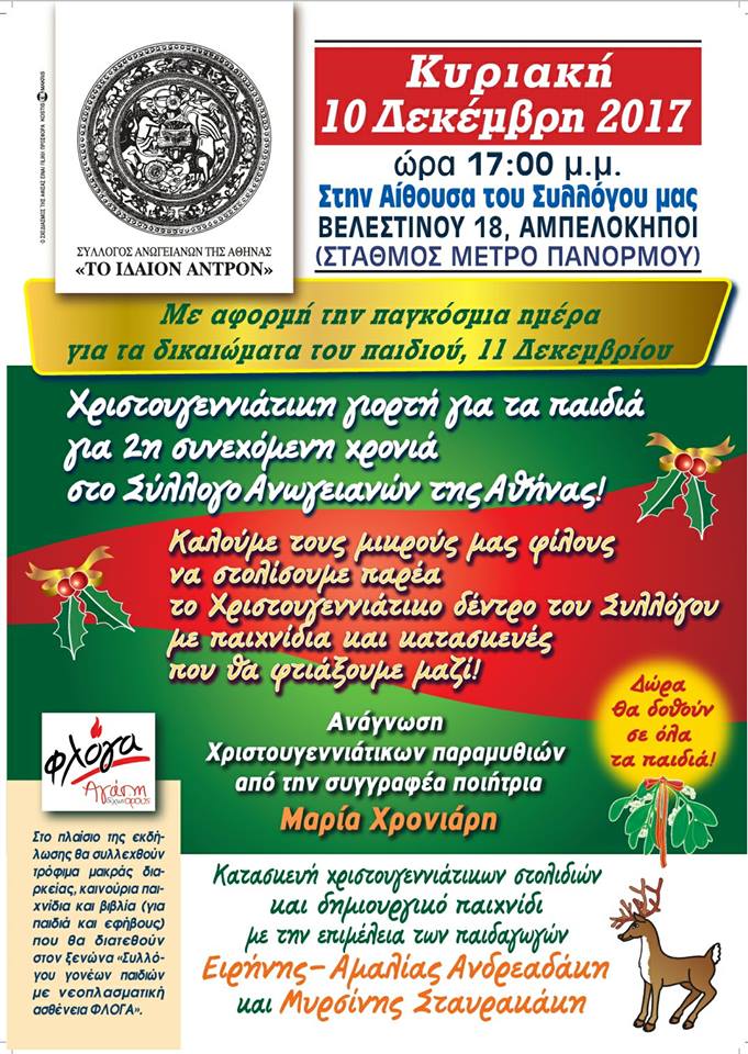 Χριστουγεννιάτικη γιορτή για τα παιδιά, διοργανώνει ο Σύλλογος των Ανωγειανών της Αθήνας “Το Ιδαίον Άντρον”, την ερχόμενη Κυριακή 10 Δεκεμβρίου στις 5 μ.μ, στα γραφεία του στους Αμπελόκηπους (Βελεστίνου 18-Στάση Μετρό Πανόρμου). Η εκδήλωση που θα λάβει χώρα για δεύτερη συνεχόμενη χρονιά, γίνεται και με αφορμή την παγκόσμια ημέρα για τα δικαιώματα του παιδιού που είναι η 11η Δεκεμβρίου, ενώ παράλληλα με τα παιχνίδια με τα παιδιά, στον χώρο θα συλλέγονται τρόφιμα μακράς διαρκείας, παιχνίδια και βιβλία που θα δοθούν στον ξενώνα “Συλλόγου γονέων,παιδιών με νεοπλασματική ασθένεια Φλόγα”.