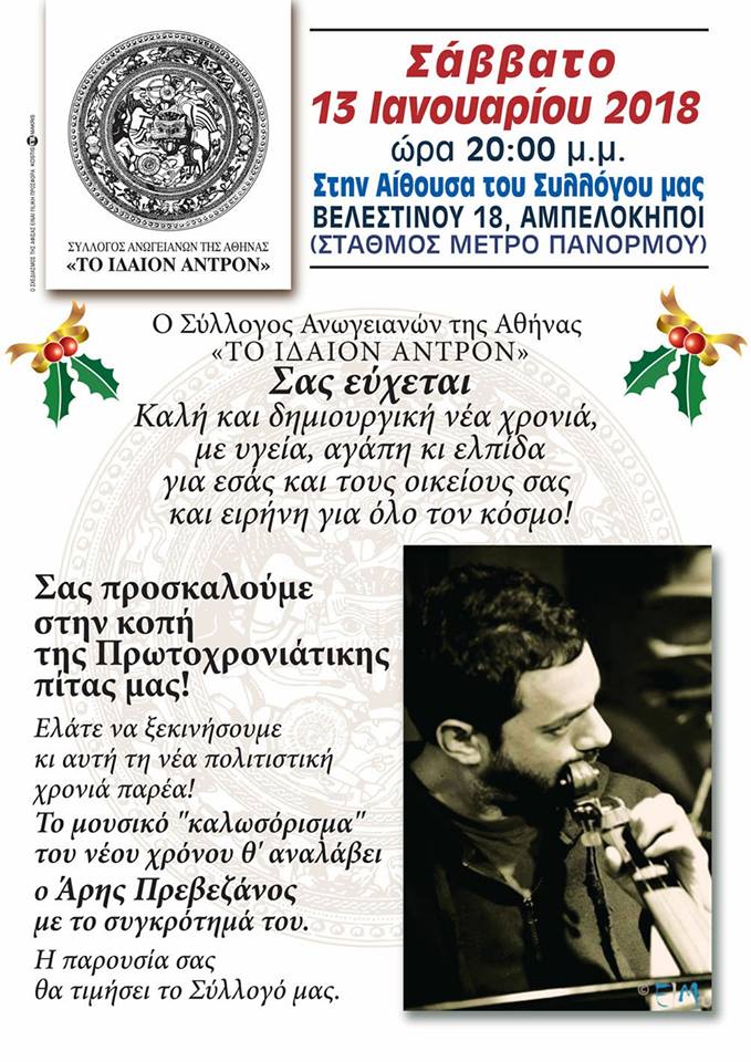 Το ερχόμενο Σάββατο 13 Ιανουαρίου, στις 8 μ.μ θα γίνει η κοπή της πρωτοχρονιάτικης πίτας, του Συλλόγου των Ανωγειανών της Αθήνας “Το Ιδαίον Άντρον”, στα γραφεία στους Αμπελόκηπους (Βελεστίνου 18-Στάση Μετρό Πανόρμου). Το μουσικό καλωσόρισμα για τη νέα χρονιά θα αναλάβει ο καλός φίλος και λυράρης, Άρης Πρεβεζάνος με το συγκρότημα του. Όπως αναφέρει και ο σύλλογος των Ανωγειανών:”Ελάτε να ξεκινήσουμε κι αυτή τη νέα Πολιτιστική χρονιά παρέα! Με το καλό να σμίξουμε το Σάββατο, στα γραφεία του Συλλόγου μας για να ανταλλάξουμε από κοντά τις ευχές μας..”