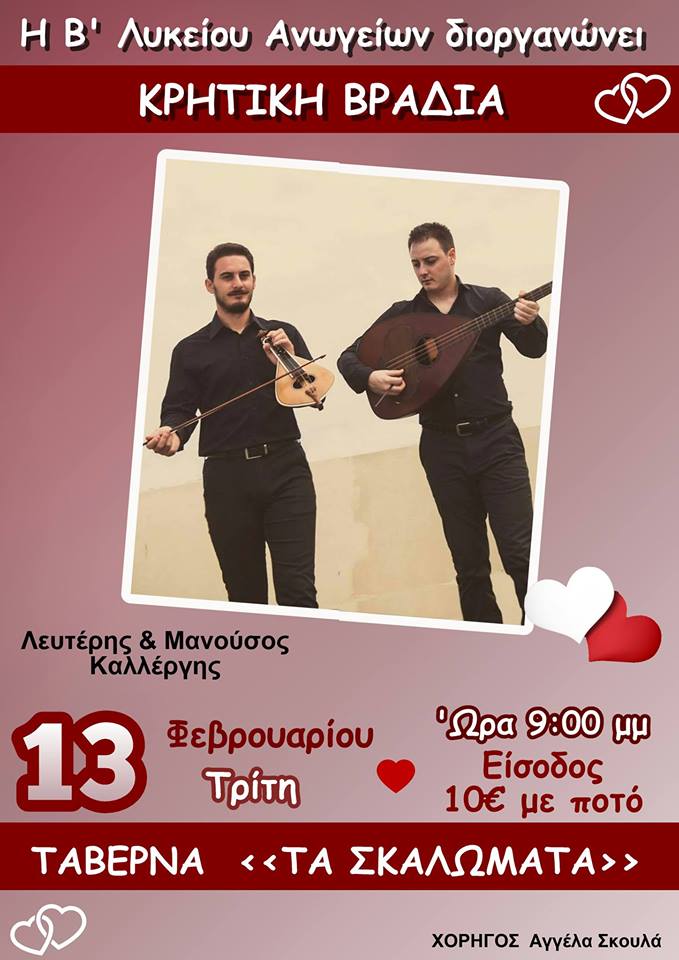 Η Β’ Λυκείου Ανωγείων σας προσκαλεί στην Χοροεσπερίδα που διοργανώνει στο κέντρο “ΤΑ ΣΚΑΛΏΜΑΤΑ” την Τρίτη 13 Φεβρουαρίου και ώρα 9:00 μ.μ .Θα μας διασκεδάσει το συγκρότημα Λευτέρη & Μανούσου Καλλέργη, Συμμετέχουν οι μουσικοί: Θωμάς Μπολάκης και Μιχάλης Σαββάκης. Είσοδος 10 ευρώ με ποτό.