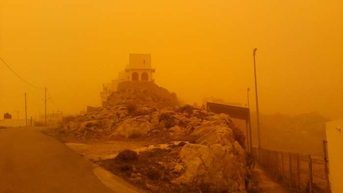 Αποπνικτική είναι και στα Ανώγεια, όπως και σε ολόκληρη την υπόλοιπη Κρήτη, η κατάσταση και η ατμόσφαιρα από τους ισχυρούς Νότιους ανέμους αλλά και την αφρικανική σκόνη που έχει καλύψει τα πάντα στο πέρασμα της. Οι ισχυροί Νοτιάδες πνέουν από τα μεσάνυχτα και συνεχίζονται μέχρι και το απόγευμα της Πέμπτης ενώ σε κάποιες ώρες έφτασαν μέχρι και τα 8 μποφόρ με την θερμοκρασία να είναι σταθερά πάνω από τους 20 βαθμούς Κελσίου. Το σκηνικό θυμίζει Νότια Αφρική με τους κατοίκους των Ανωγείων να μην μπορούν από τα μπαλκόνια τους να αντικρίσουν ούτε τον Ψηλορείτη, που έχει καλυφθεί μέσα σε ένα κίτρινο πέπλο!