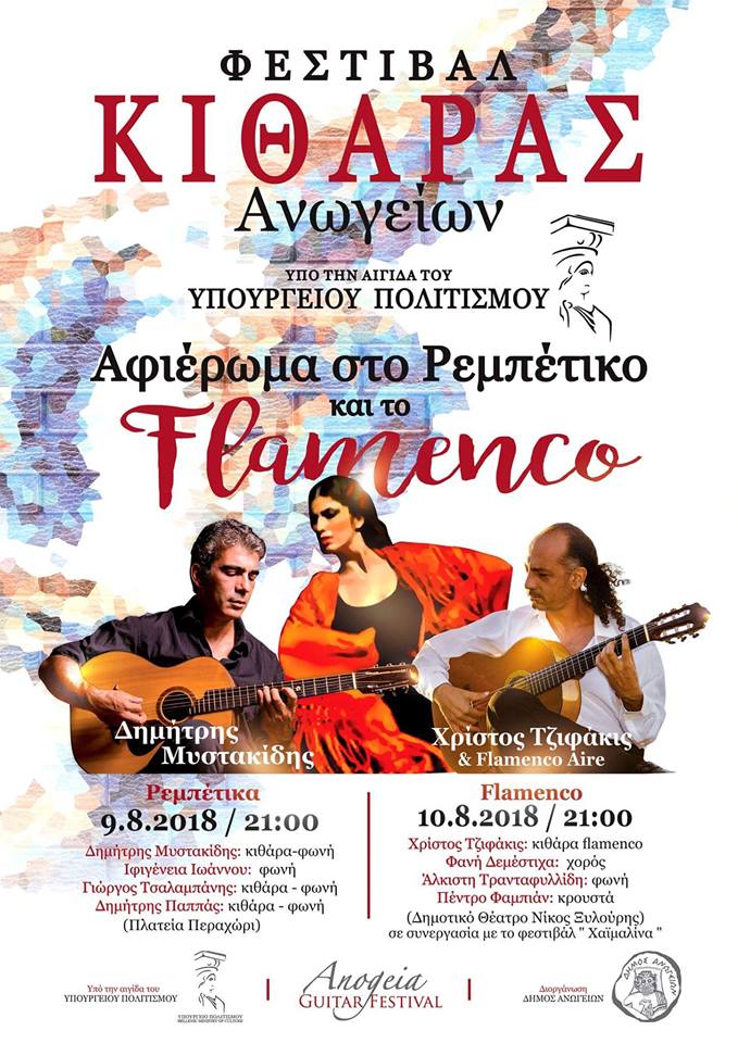 Το φετινό Φεστιβάλ Κιθάρας Ανωγείων είναι αφιερωμένο στο Ρεμπέτικο και το Flamenco. Την διοργάνωση έχει ο Δήμος Ανωγείων, ενώ φέτος τελεί υπό την αιγίδα του Υπουργείου Πολιτισμού. Διοργανώνεται για τέταρτη συνεχόμενη χρονιά στα Ανώγεια. Όπως αναφέρει και ο καλλιτεχνικός διευθυντής Χρίστος Τζιφάκις “:Ο τόπος αυτός είναι ένα ζωντανό εργαστήρι μουσικής, χορού και ποίησης. Χωρίς σχολές, ωδεία ή μουσικές ακαδημίες. Το πεδίο που εκφράζονται είναι οι εκδηλώσεις της καθημερινότητας του χωριού. Η παράδοση στ’ Ανώγεια δεν είναι κλεισμένη στο μουσείο, αλλά εξελίσσεται χωρίς να κάνει εκπτώσεις στην ποιότητα και την αλήθεια..”