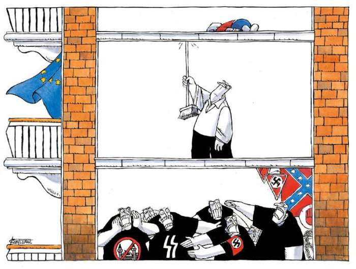 στα Ανώγεια η έκθεση σκίτσου «Made in Europe» του Μιχάλη Κουντούρη με αντιπολεμικές και αντιφασιστικές γελοιογραφίες.