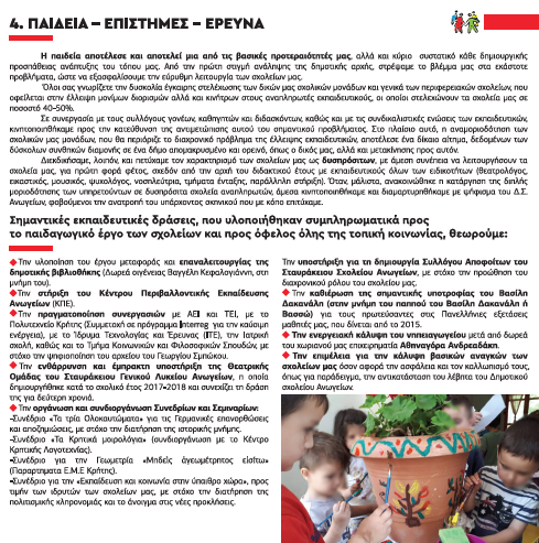 Ο τέταρτος άξονας του προγράμματος της δημοτικής κίνησης του Εμμανουήλ Καλλέργη “Τα Ανώγεια Μπροστά” αφορά τους τομείς της παιδείας, των επιστημών και της έρευνας. Αναλυτικά: