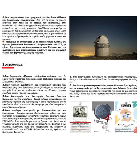 - Στη δημιουργία αστεροσχολείου από το Πανεπιστήμιο Κρήτης, που σε συνεργασία με το Αστεροσκοπείο του Σκίνακα θα ανοίξει νέους ορίζοντες και θα φέρει τους μαθητές πιο κοντά σε μια επιστήμη που ανθίζει δίπλα μας και το περαιτέρω άνοιγμα του στην κοινωνία των Ανωγείων.