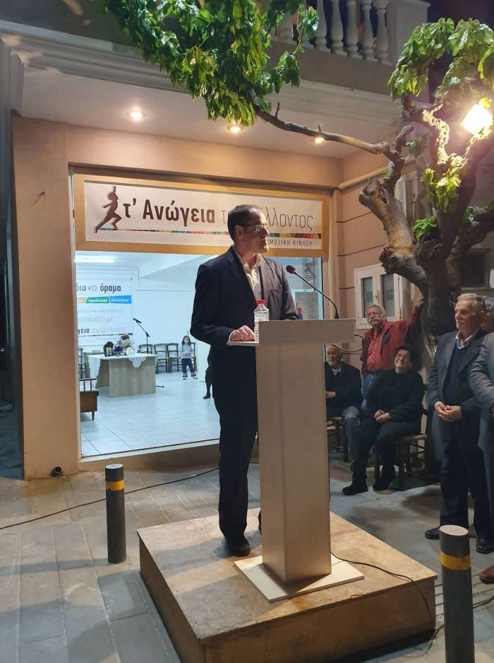 Πλήθος κόσμου βρέθηκε χθες στα εγκαίνια του εκλογικού κέντρου του υποψήφιου δημάρχου Ανωγείων Σωκράτη Κεφαλογιάννη και του συνδυασμού του “Ενωτική Δημοτική Κίνηση-Τ’Ανώγεια του Μέλλοντος. Γυναίκες και άνδρες όλων των ηλικιών βρέθηκαν εκεί για να σφίξουν το χέρι του υποψηφίου δημάρχου Ανωγείων και να ευχηθούν καλή δύναμη στον αγώνα τόσο του ίδιου όσο και των 23 μελών του ψηφοδελτίου του. “Τα Ανώγεια είμαστε εμείς και η ζωή μας είναι συνυφασμένη με τούτο τον τόπο και την μοίρα του που εμείς καθορίζουμε..” ανέφερε χαρακτηριστικά ο κ.Κεφαλογιάννης στην ομιλία του και ολοκλήρωσε λέγοντας ότι “Σήμερα ο δήμος, η Ανωγειανή κοινωνία στο σύνολό της χρειάζεται μία Νέα Πνοή, μία έκρηξη Συλλογικής Ευθύνης πάνω σε ένα καλά σχεδιασμένο πρόγραμμα για τα Ανώγεια του Μέλλοντος..”