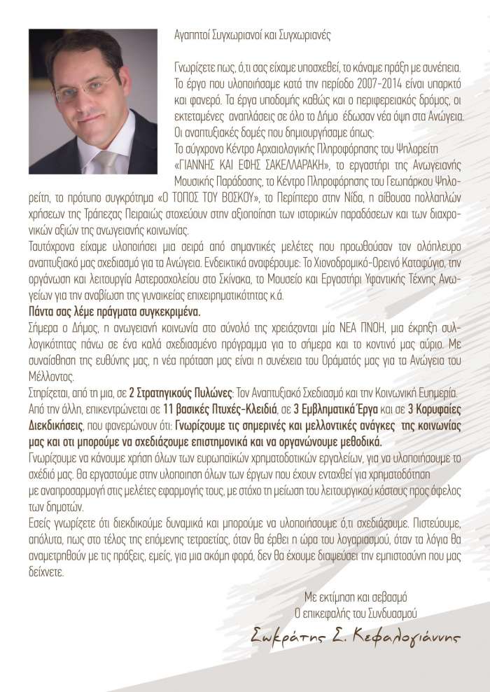Γνωρίζετε πως, ό,τι σας είχαμε υποσχεθεί, το κάναμε πράξη με συνέπεια.Το έργο που υλοποιήσαμε κατά την περίοδο 2007-2014 είναι υπαρκτό και φανερό. Τα έργα υποδομής, καθώς και ο κεντρικός , ο περιφερειακός δρόμος,οι εκτεταμένες αναπλάσεις σε όλο το Δήμο, έδωσαν νέα αισθητική όψη στα Ανώγεια.