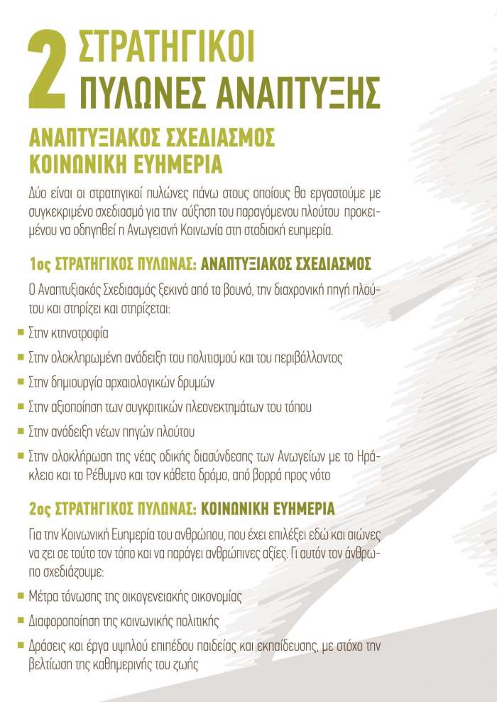 Δύο είναι οι στρατηγικοί πυλώνες πάνω στους οποίους θα εργαστούμε για την αύξηση του παραγόμενου πλούτου με συγκεκριμένο σχεδιασμό προκειμένου να οδηγηθεί η Ανωγειανή Κοινωνία στη σταδιακή ευημερία.