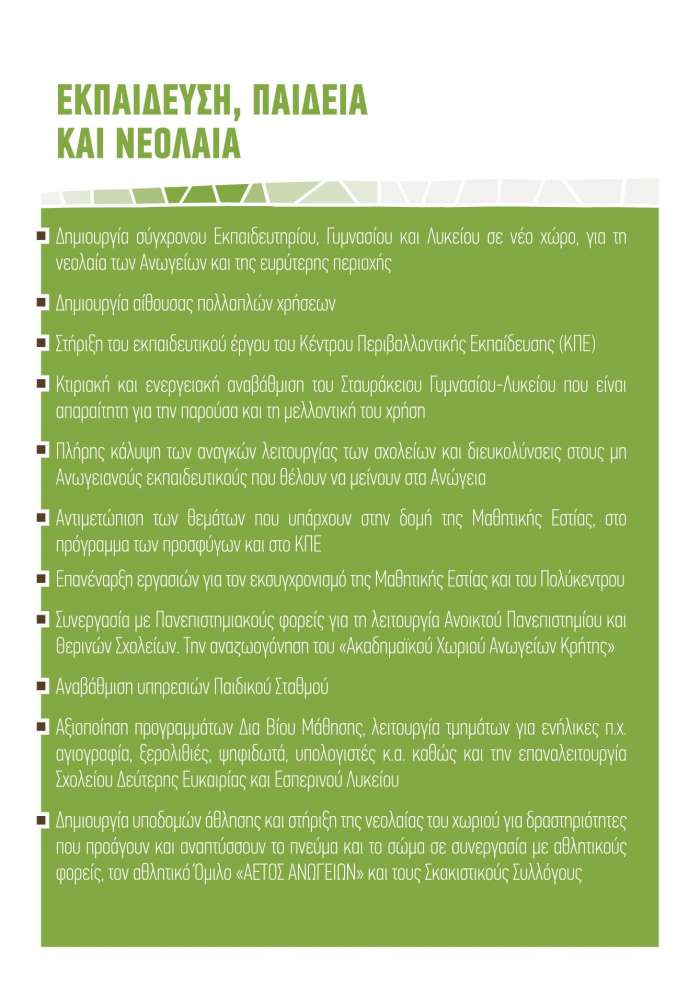 – Συνεργασία με Πανεπιστημιακούς φορείς για τη λειτουργία Ανοικτού Πανεπιστημίου και Θερινών Σχολείων. Επαναλειτουργία «Ακαδημαϊκού Χωριού» Ανωγείων Κρήτης
