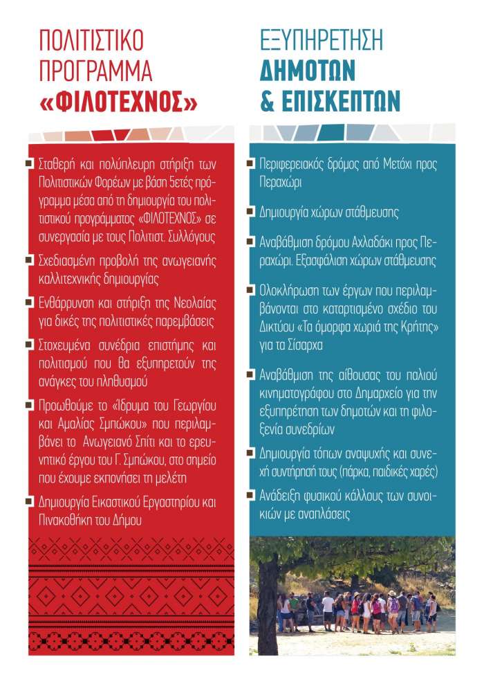 -Σταθερή και πολύπλευρη στήριξη των Πολιτιστικών Φορέων με βάση πενταετές πρόγραμμα μέσα από την δημιουργία του πολιτιστικού προγράμματος «ΦΙΛΟΤΕΧΝΟΣ», σε συνεργασία με τους Πολιτιστικούς Συλλόγους.