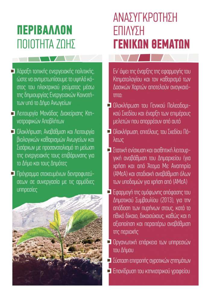 -Χάραξη τοπικής ενεργειακής πολιτικής, ώστε να αντιμετωπίσουμε το υψηλό κόστος του ηλεκτρικού ρεύματος μέσω της δημιουργίας Ενεργειακών Κοινοτήτων υπό το Δήμο Ανωγείων.