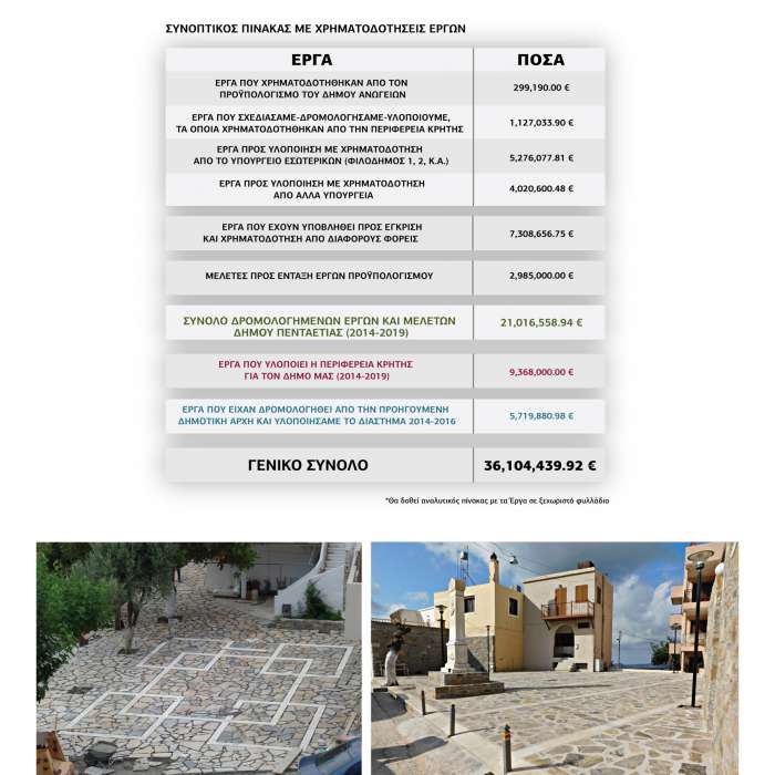 Αυτά τα χρόνια της θητείας μας, διαχειριστήκαμε όλα τα θέματα του Δήμου με διαύγεια και συνεννόηση με όλες τις παρατάξεις, μέσω των υπηρεσιών του Δήμου. Με ηθική, τιμιότητα και διαφάνεια. Υποχρέωση μας η κοινωνική συνοχή και για αυτό αντιμετωπίσαμε τις όποιες δύσκολες καταστάσεις που προέκυψαν κατά τη διάρκεια της θητείας μας, με νομιμότητα, ισονομία και στόχο την εξυπηρέτηση όλου του κοινωνικού συνόλου. Συμβάλλαμε με όλες μας τις δυνάμεις στο να διατηρήσουμε το όνομα Ανώγεια σε υψηλά στάνταρ και τα καταφέραμε.