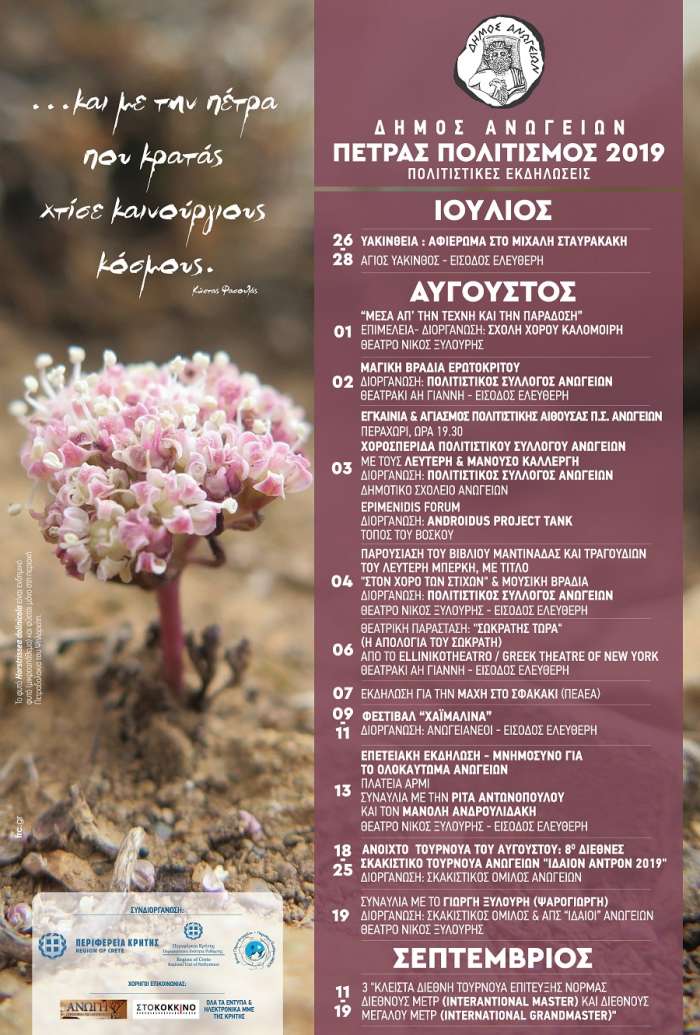 Με την μεγάλη συναυλία της Ρίτας Αντωνοπούλου και του Μανόλη Ανδρουλιδάκη στο θέατρο Νίκος Ξυλούρης στην επέτειο του Ολοκαυτώματος στις 13 Αυγούστου θα κορυφωθούν οι εκδηλώσεις του Δήμου Ανωγείων “Πέτρας Πολιτισμός” για αυτό το καλοκαίρι. Θέατρο, μουσική, σκάκι με το μεγάλο διεθνές τουρνουά “Ιδαίον Άντρο” καθώς και το τριήμερο του Φεστιβάλ “Χαιμαλίνα” περιλαμβάνονται στο φετινό πρόγραμμα.