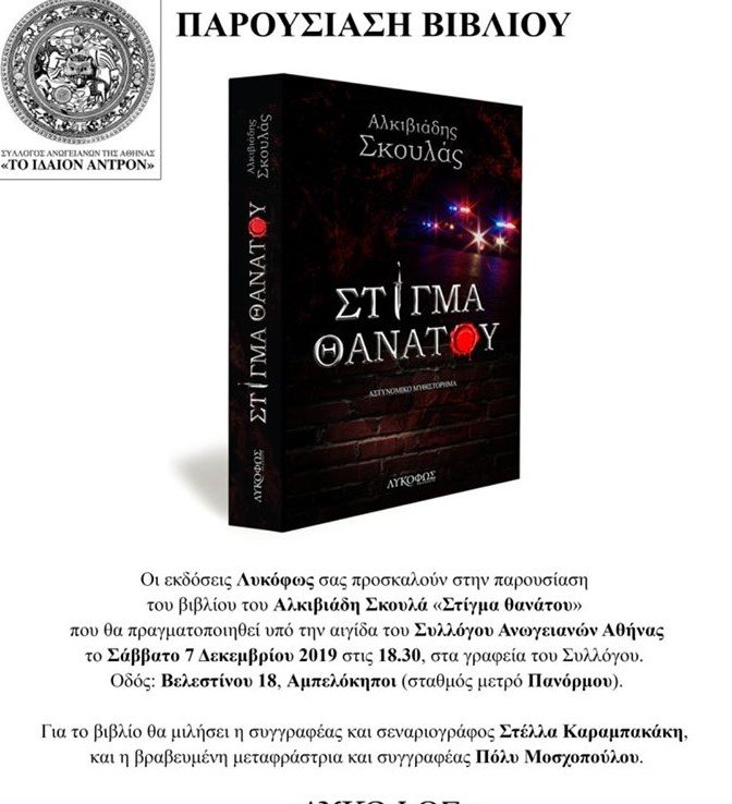 Οι εκδόσεις “Λυκόφως”σας προσκαλούν στην παρουσίαση του βιβλίου του Αλκιβιάδη Σκουλά “Στίγμα Θανάτου”, που θα πραγματοποιηθεί υπό την αιγίδα του Συλλόγου των Ανωγειανών της Αθήνας, το Σάββατο 7 Δεκεμβρίου στις 6.30 μ.μ στα