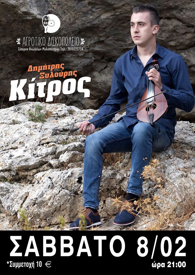 Ο Δημήτρης Ξυλούρης (Κίτρος) γεννημένος στο Δυτικό τμήμα των Ανωγείων «αναπνέει» το ίδιο φως και γεύεται τους ίδιους «σκοπούς» που ανέπνευσαν και γλέντησαν οι πιο παλιοί από τους παλιούς μας λυράρηδες! Το Σάββατο 8 Φεβρουαρίου και ώρα 21:00 σας περιμένουμε στο αγροτικό δισκοπωλείο (Σίσαρχα Ανωγείων) Τηλ. κρατήσεων 2810225758, 10 € / άτομο με ποτό και κρύο πιάτο