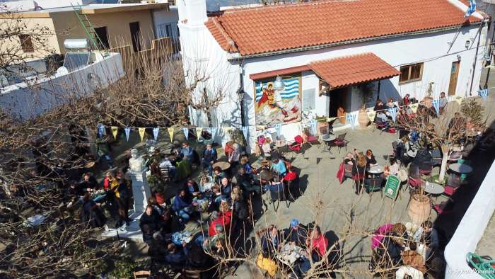 Μετά από το εκπληκτικό καλωσόρισμα (αξίζει να δείτε το βίντεο) και την αρτοκλασία σταθήκαμε κάτω από τον αστραφτερό χειμωνιάτικο ήλιο στην πλατεία, έξω από την εκκλησιά για μια ρακί και κρητικούς μεζέδες με προεξέχουσα τη μυζήθρα και τη γραβιέρα.