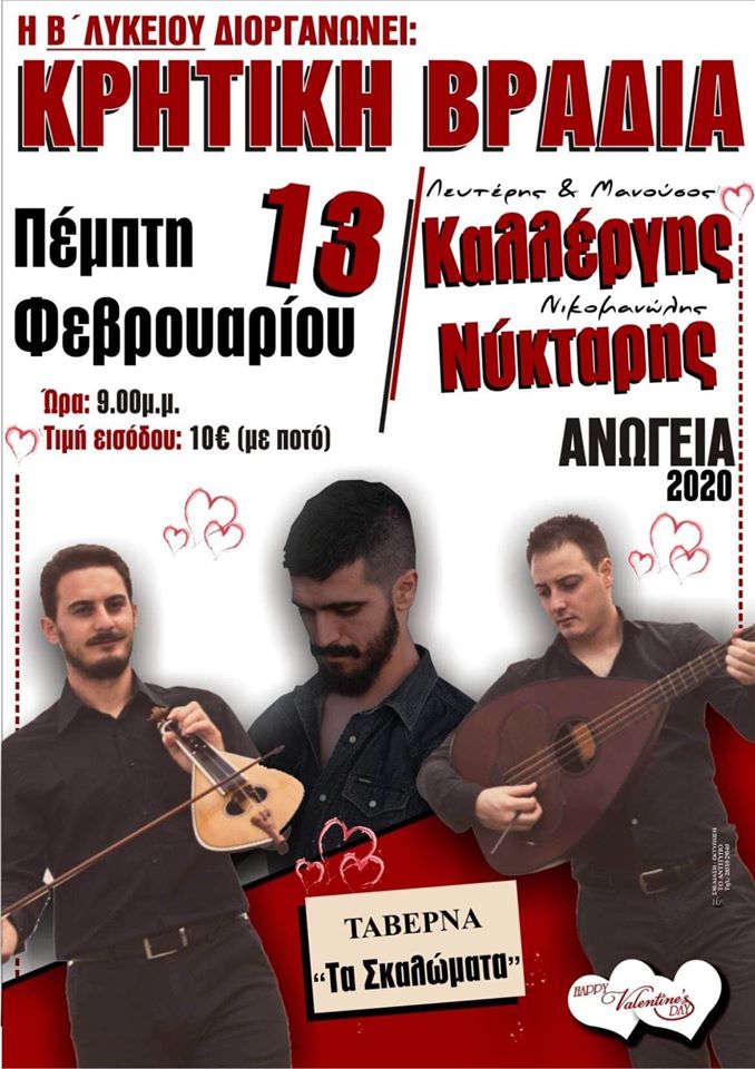 Χοροεσπερίδα για την οικονομική της ενίσχυση, διοργανώνει η Β’Λυκείου Ανωγείων, μια ημέρα πριν τη γιορτή των…ερωτευμένων, την Πέμπτη 13 Φεβρουαρίου στις 9 μ.μ στην παραδοσιακή ταβέρνα “Τα Σκαλώματα”. Την διασκέδαση του κόσμου που θα παρευρεθεί αναλαμβάνουν οι ταλαντούχοι μουσικοί μας, Λευτέρης και Μανούσος Καλλέργης και Νικομανώλης Νύκταρης.