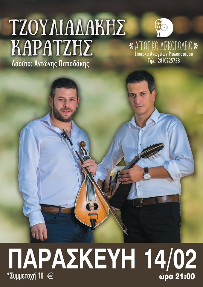 Παρασκευή 14 Φεβρουαρίου στις 9 μ.μ στο αγροτικό δισκοπωλείο (Σίσαρχα Ανωγείων Μυλοποτάμου). Νίκος Τζουλιαδάκης – Νικόλας Καράτζης – Αντώνης Παπαδάκης 10€ / άτομο με ποτό και κρύο πιάτο.