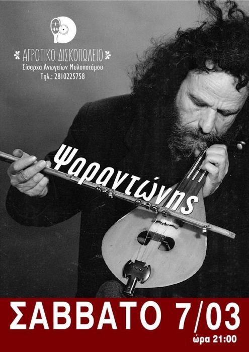 Ο Ψαραντώνης σε μία μοναδική βραδιά στο αγροτικό δισκοπωλείο το Σάββατο 7 Μαρτίου και ώρα 21:00. Μαζί του η Νίκη Ξυλούρη και ο Βασίλης Ξυλούρης. Μην το χάσετε!
