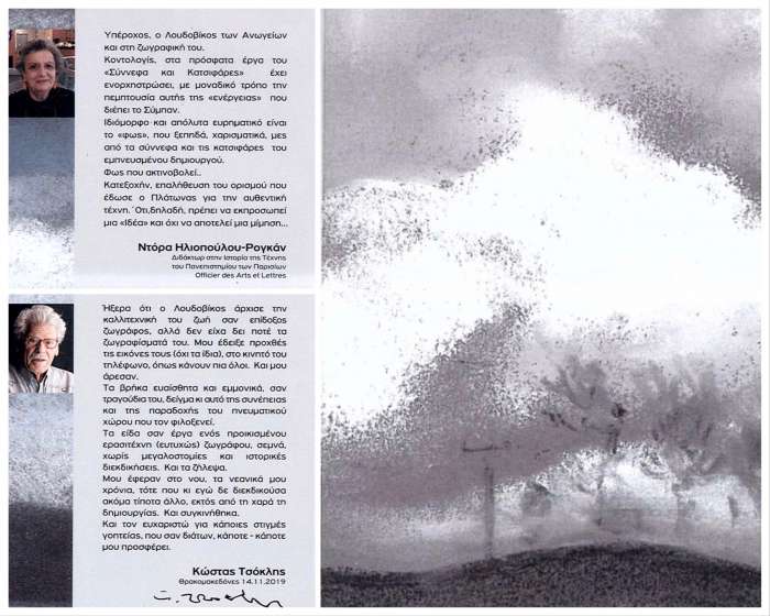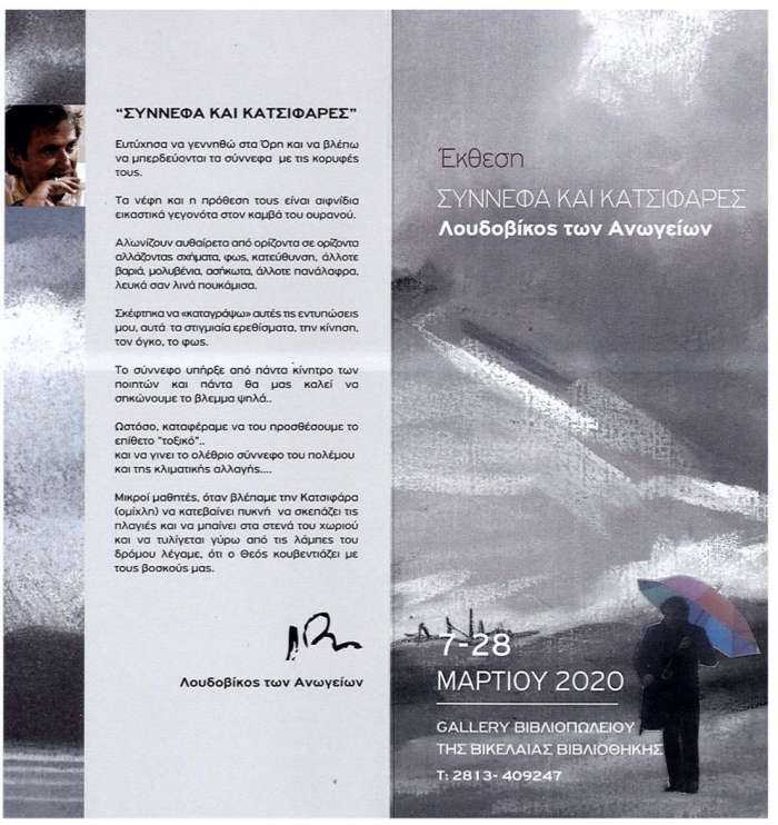 Εγκαινιάζεται την Πέμπτη 12 του Μάρτη στις 18:00 στη gallery του Βιβλιοπωλείου της Βικελαίας Βιβλιοθήκης η νέα έκθεση ζωγραφικής του Λουδοβίκου των Ανωγείων με τίτλο «Σύννεφα και κατσιφάρες» .Σε συνέχεια της επιτυχημένης έκθεσης «Με δυο λέξεις και ένα βλέμμα» που πραγματοποιήθηκε πριν ένα χρόνο, ο Λουδοβίκος των Ανωγείων επιστρέφει με νέα έργα.