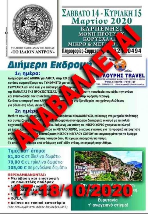 “Σεβόμενοι τις επικρατούσες συνθήκες και τα κρατικά μέτρα προστασίας κατά του κορονοϊού, αναβάλλουμε την ετήσια εκδρομή μας, που ήταν προγραμματισμένη για το ερχόμενο Σαββατοκύριακο, 14-15 Μαρτίου 2020, για τον Οκτώβρη, 17-18.